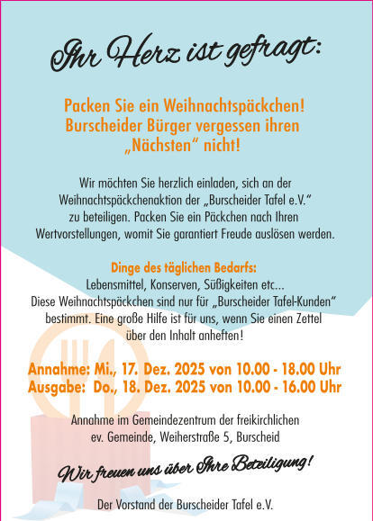 Burscheider Tafel e.V.Kreissparkasse KölnIBANDE03370502990381551896BICCOKSDE33XXX